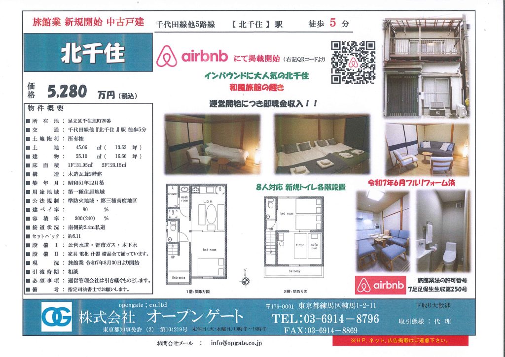 民泊用戸建【北千住Ⅰ】旅館業開始しました。